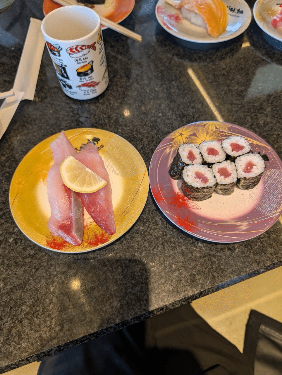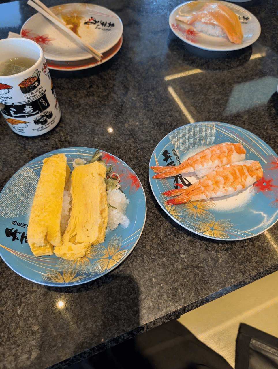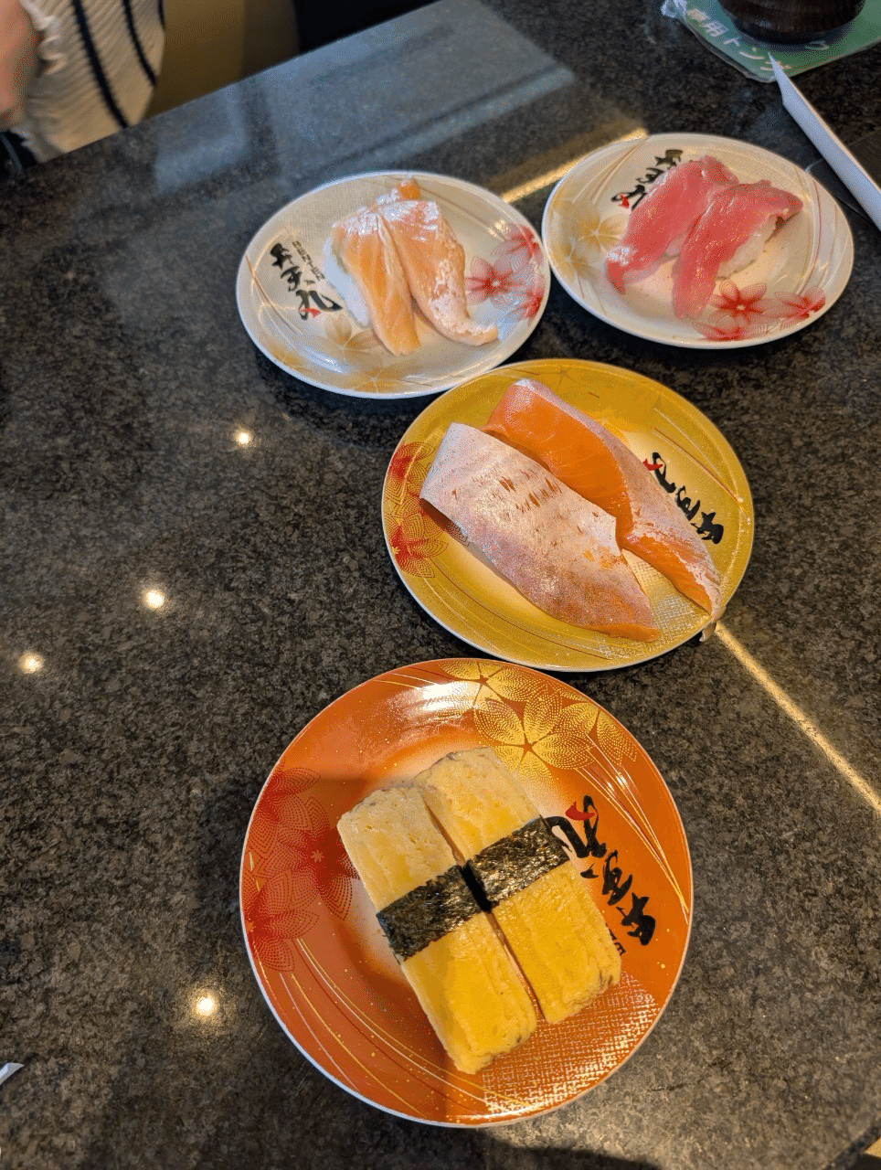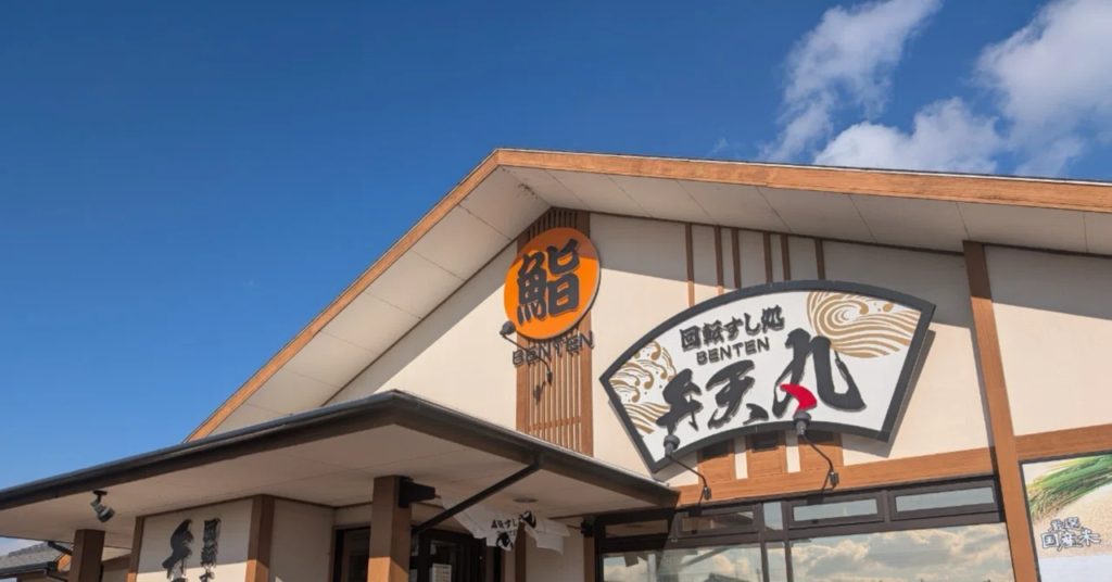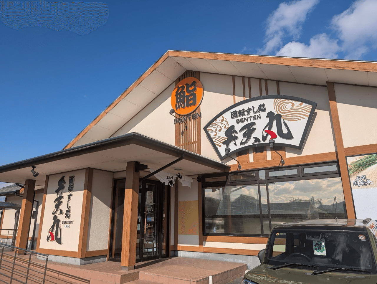 3時間ほど走った後、岡山市内に到着。まず訪れたのは、地元で人気の回転寿司店「弁天丸」です。店内は清潔で活気があり、平日でも多くの地元客が訪れていました。