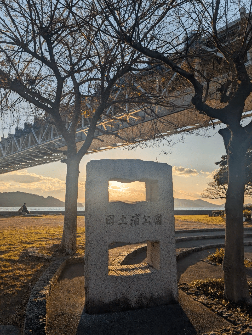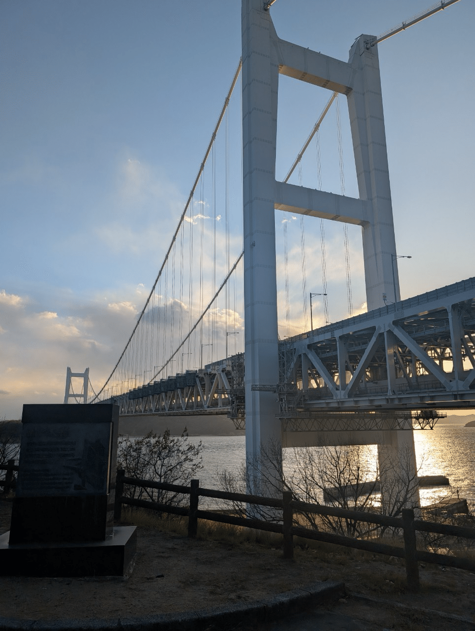 岡山を離れ、瀬戸大橋展望台へ向かいます。車を走らせること約40分、瀬戸内海を見渡せる絶好のポイントに到着しました。ここから望む瀬戸大橋は壮大で、瀬戸内海に浮かぶ島々とのコントラストが美しい景色を作り出しています。