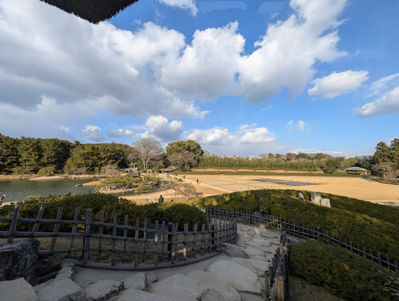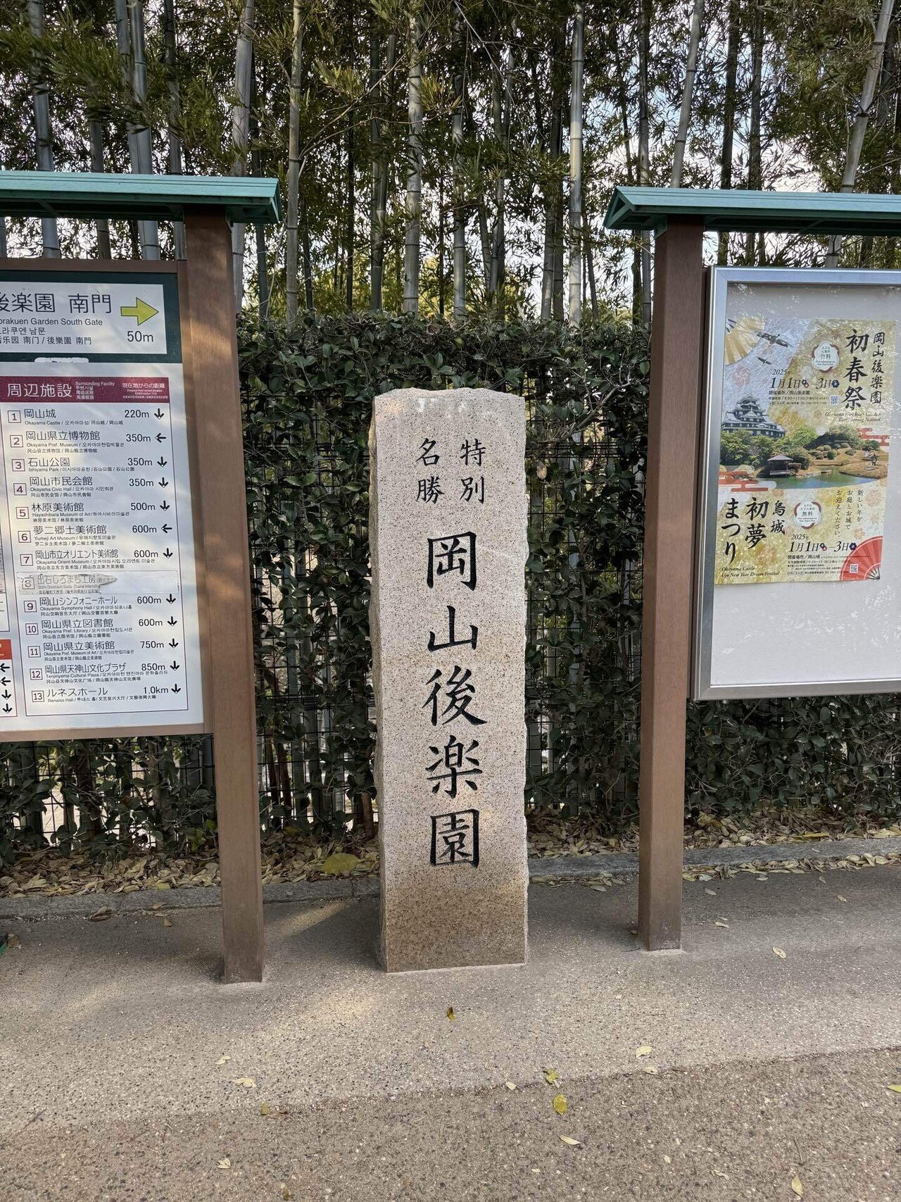 次に向かったのは、日本三名園の一つ「後楽園」。岡山城のすぐ隣に位置し、広大な敷地内には美しい芝生や池、季節の花々が広がります。冬の澄んだ空気の中、庭園を散策すると、心がすっと落ち着いていくのを感じました。