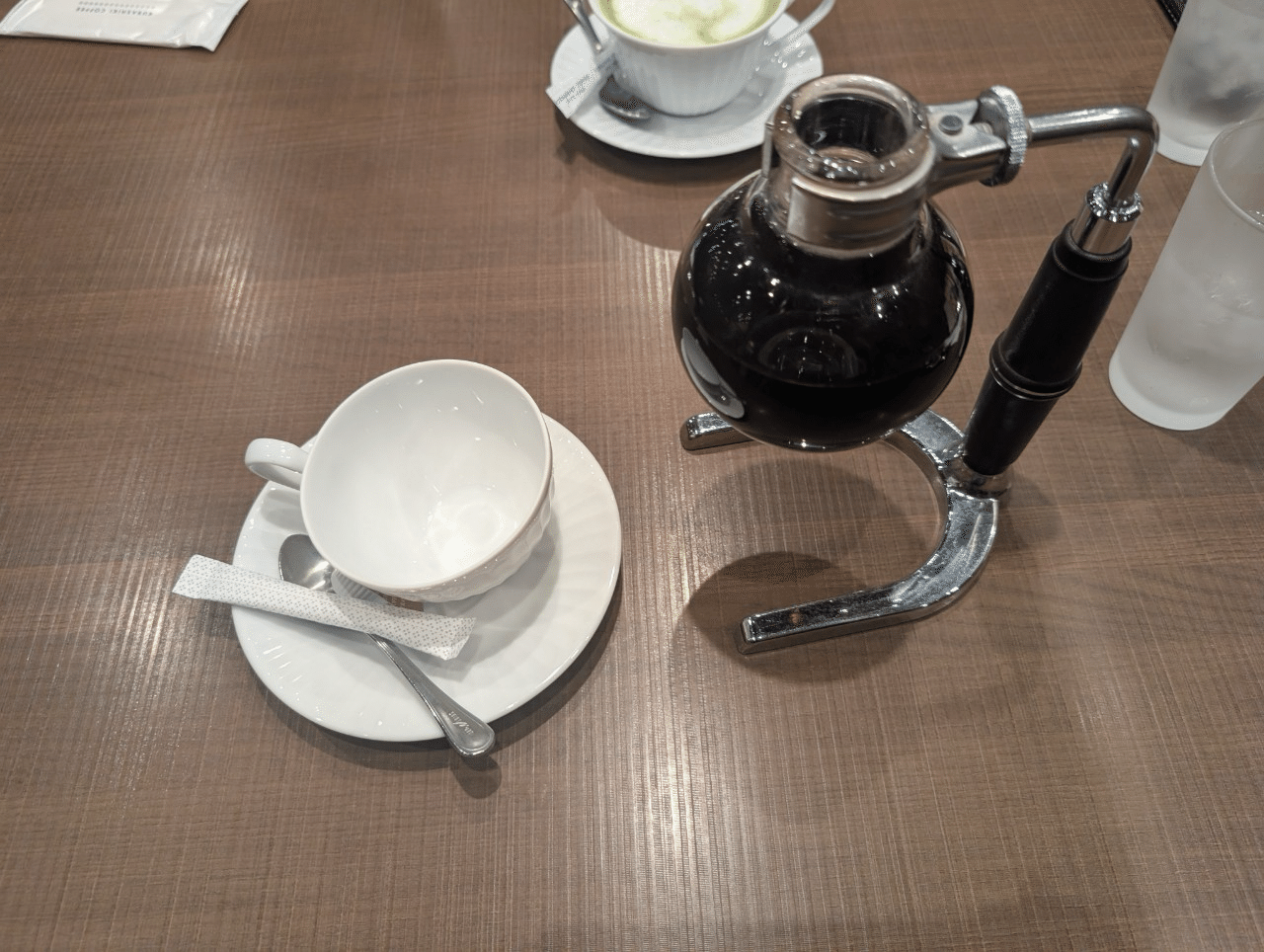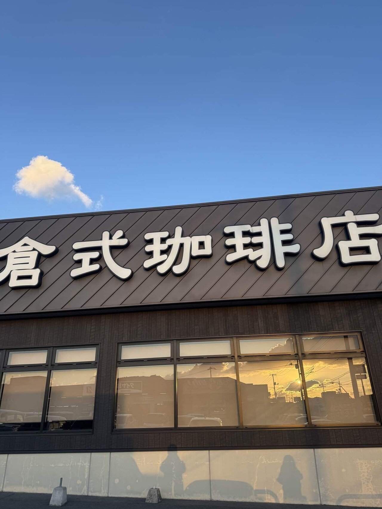夕焼けを楽しんだ後は、近くの「倉式珈琲店」でひと休み。落ち着いた雰囲気の店内で、ハンドドリップのコーヒーを楽しみました。注文したのはブレンドコーヒーとチーズケーキのセット。香ばしいコーヒーの香りに包まれながら、ゆったりとした時間を過ごしました。
