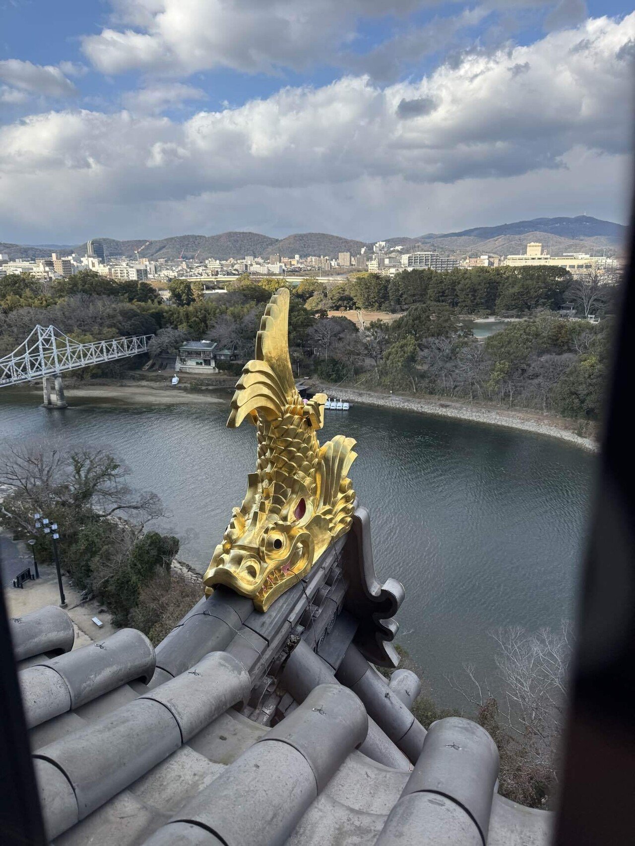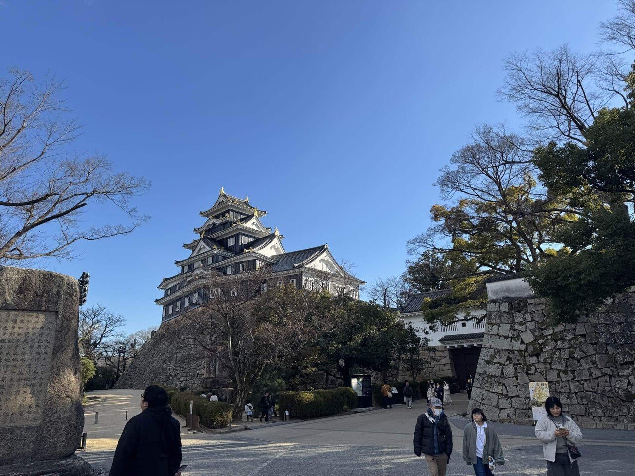 昼食後は、「烏城(うじょう)」の愛称で知られる岡山城を訪れました。黒い外観が特徴的で、青空に映える姿は圧巻です。天守閣まで登り、岡山市内を一望しました。城内では、戦国時代の歴史や文化に触れる展示が充実しており、歴史好きにはたまらないスポットです。